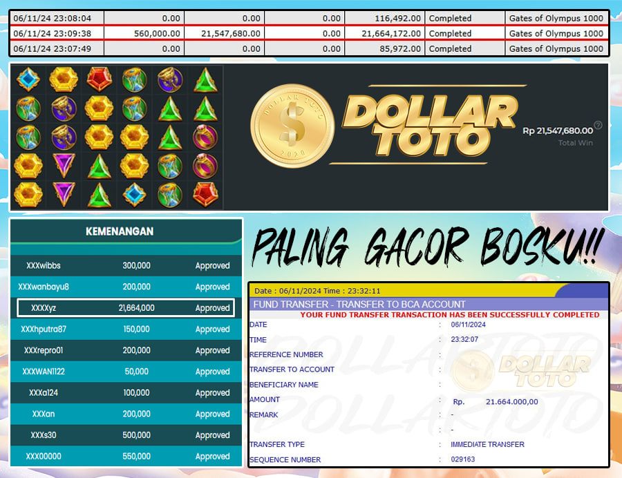 SELAMAT KEPADA MEMBER DOLLARTOTO, USER ID : XXXXyz, MENANG DI GAME PRAGMATIC SLOT GATES OF OLYMPUS 1000