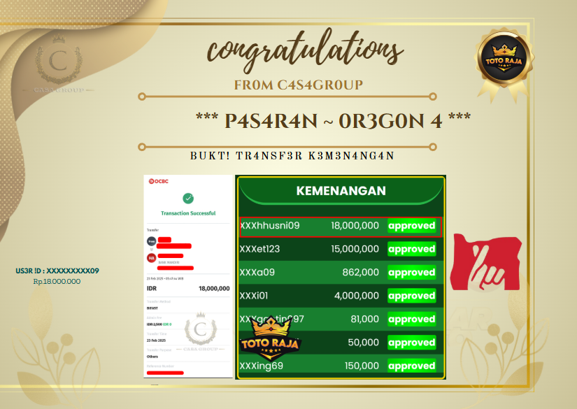 Selamat kepada user id XXXXXXXXXX09 yang sudah berhasil mendapatkan KEMENANGAN BESAR dari pasaran OREGON 4 .Untuk total pencairan sebesar 18 juta langsung di bayar LUNAS dan gak pakai lama ,Hanya di BO naungan casagroup yang paling Aman & Terpercaya .Bagi yang mau ikut Yukk segera daftarkan akun baru nya di >> CASAGROUP