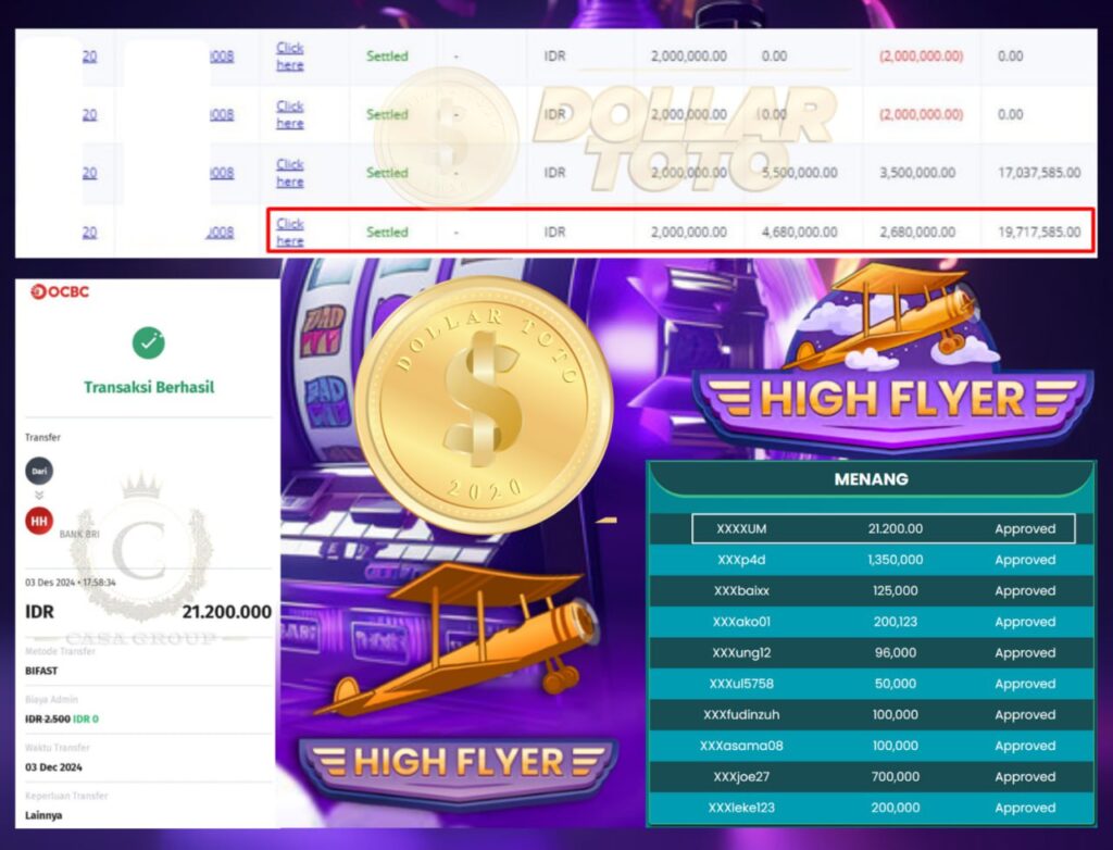 SELAMAT KEPADA MEMBER DOLLARTOTO, USER ID : XXXXUM, MENANG DI GAME PRAGMATIC PLAY > HIGH FLYER
