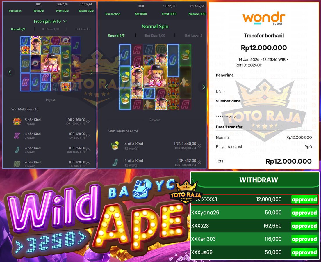 Selamat Kepada Member TOTORAJA dengan Username SXX1XXXX3 Yang Beruntung Mendapatkan Kemenangan Besar di Dalam Permainan WILD APE>> PG SOFT.
