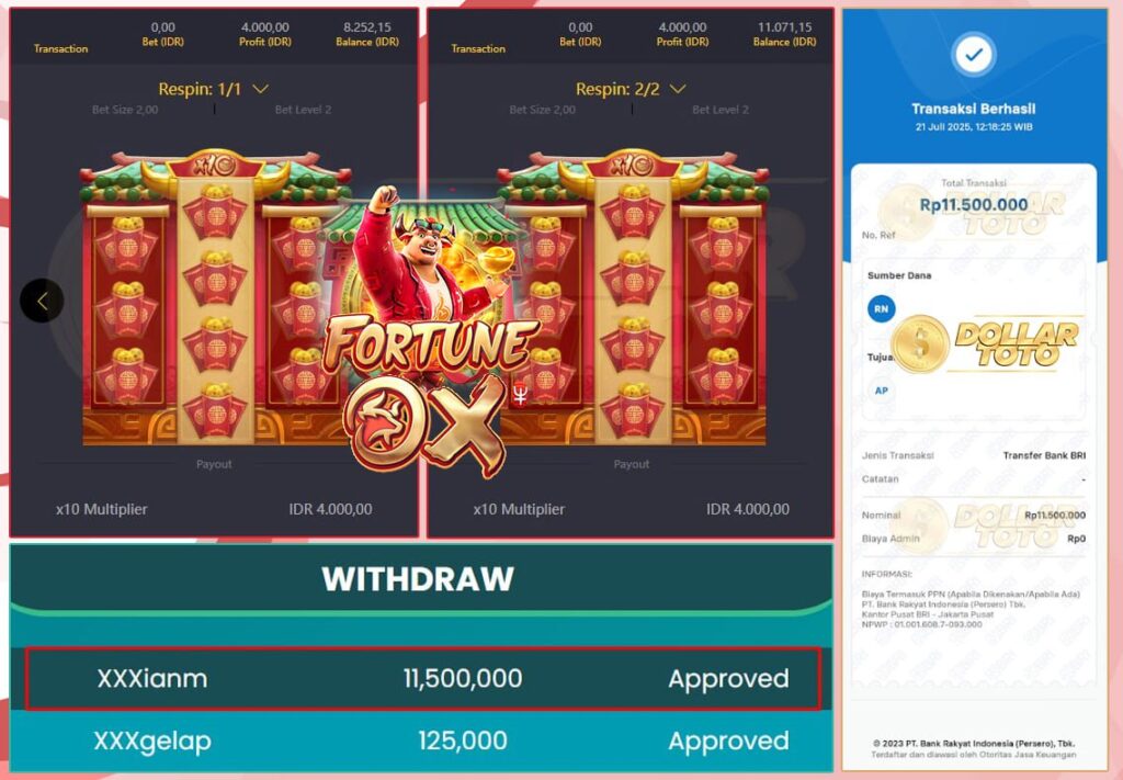 Selamat Kepada Member DOLLARTOTO dengan Username XXXianm Yang Beruntung Mendapatkan Kemenangan Besar di DOLLARTOTO Dalam Permainan FORTUNE OX >> PG SOFT.