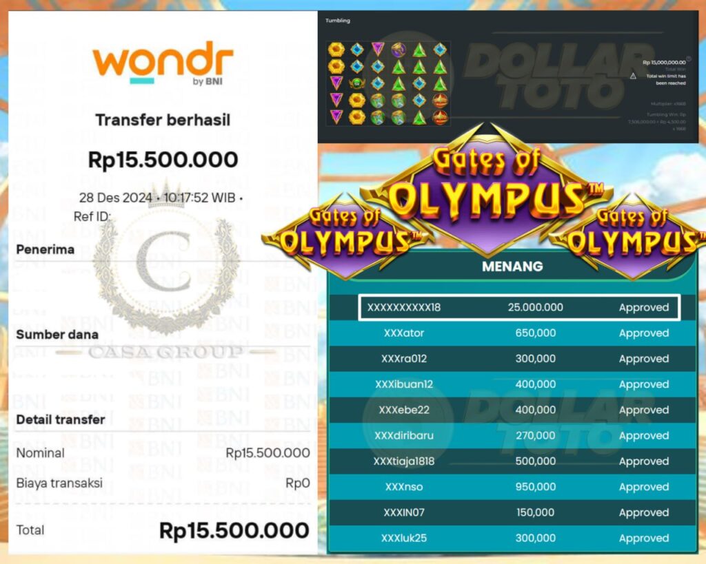 Selamat kepada bosku yang bermain di DOLLARTOTO dengan user id XXXXXXXXXX18 yang telah mendapatkan kemenangan besar di game GATES OF OLYMPUS > PRAGMATIC SLOT
