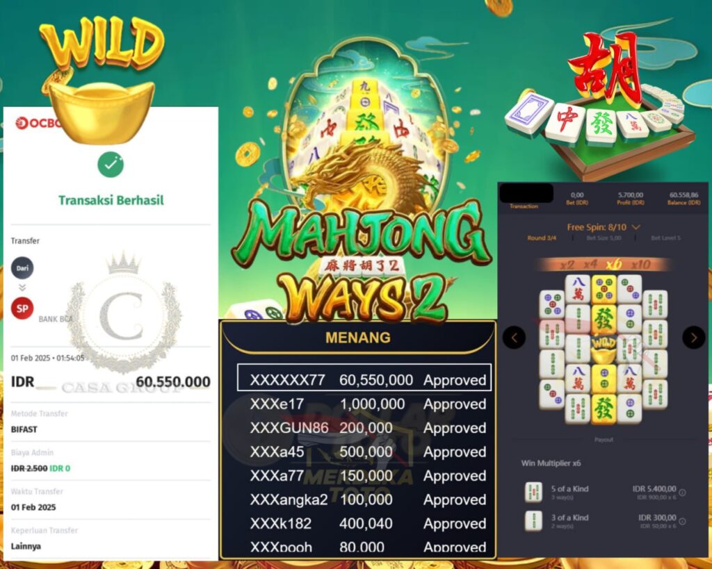 Selamat kepada member MERDEKATOTO user id XXXXXX77 yang telah mendapatkan kemenangan besar di game PG SOFT >> MAHJONG WAYS 2