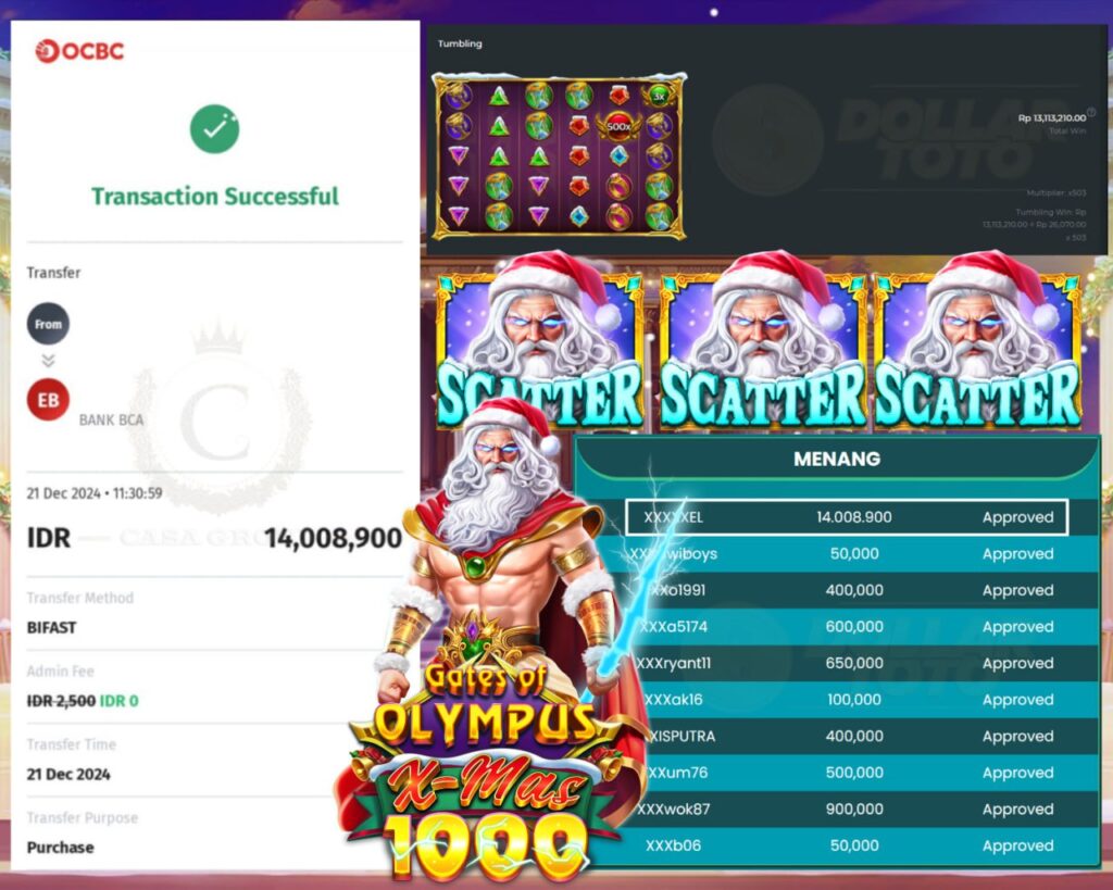 Selamat kepada bosku yang bermain di DOLLARTOTO dengan user id XXXXXEL yang telah mendapatkan kemenangan besar di game GATES OF OLYMPUS X-MAS 1000 > PRAGMATIC PLAY