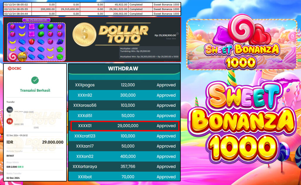 SELAMAT KEPADA MEMBER DOLLARTOTO, USER ID : XXXX01, MENANG DI GAME PRAGMATIC PLAY SWEET BONANZA 1000.