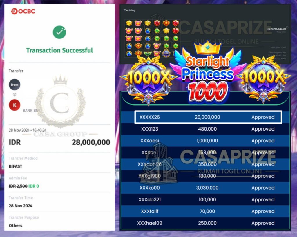 Selamat kepada bosku yang bermain di CASAPRIZE dengan user id XXXXX26 yang telah mendapatkan kemenangan besar di game STARLIGHT PRINCESS 1000 > PRAGMATIC SLOT
