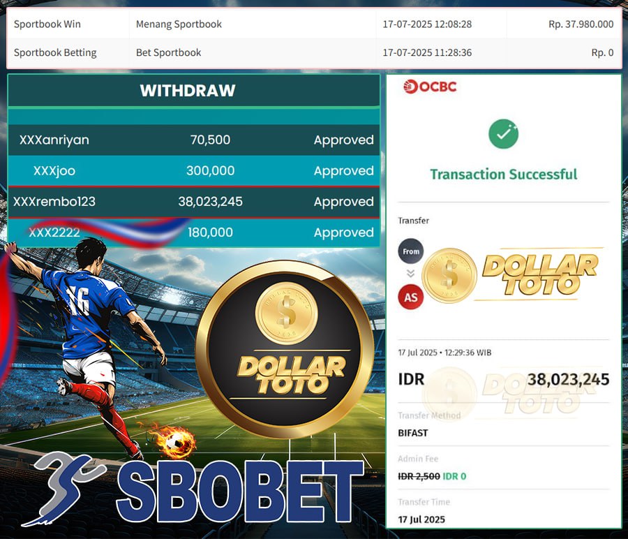 Selamat atas BIG WIN nya boss ku dengan user id XXXrembo123 yang telah mendapatkan kemenangan besar di DOLLARTOTO GAME SBOBET CASINO dengan kemenangan yang luar biasa. Untuk dana kemenangan sebesar Rp.38.023.245 Dana kemenangan sudah berhasil diproseskan tanpa adanya hambatan sedikit pun, buat para para boskuu segera langsung daftarkan di DOLLARTOTO,