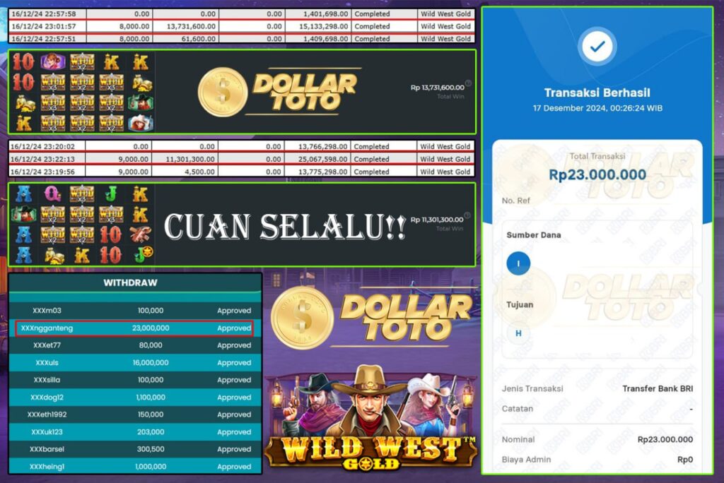 SELAMAT KEPADA MEMBER DOLLARTOTO, USER ID : XXXXXXXXXng, MENANG DI GAME PRAGMATIC > WILD WEST GOLD.