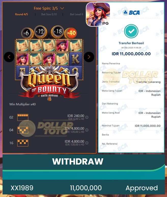 SELAMAT UNTUK MEMBER DOLLARTOTO dengan Username XX1989 berhasil meraih kemenangan besar di permainan QUEEN OF BOUNTY – PG SOFT.