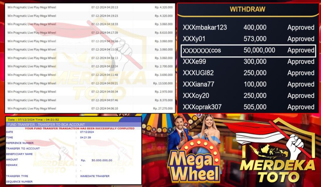 Selamat kepada member kami yang terdaftar di situs MERDEKATOTO atas id XXXXXXXcos yang telah berhasil mendapat paus di PRAGMATIC PLAY LIVE > MEGA WHEEL.