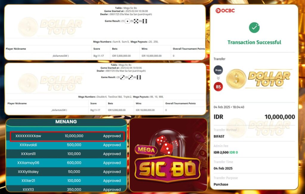 SELAMAT KEPADA MEMBER DOLLARTOTO, USER ID : XXXXXXXXXXXXXAw, MENANG DI GAME PRAGMATIC LIVE CASINO > MEGA SICBO