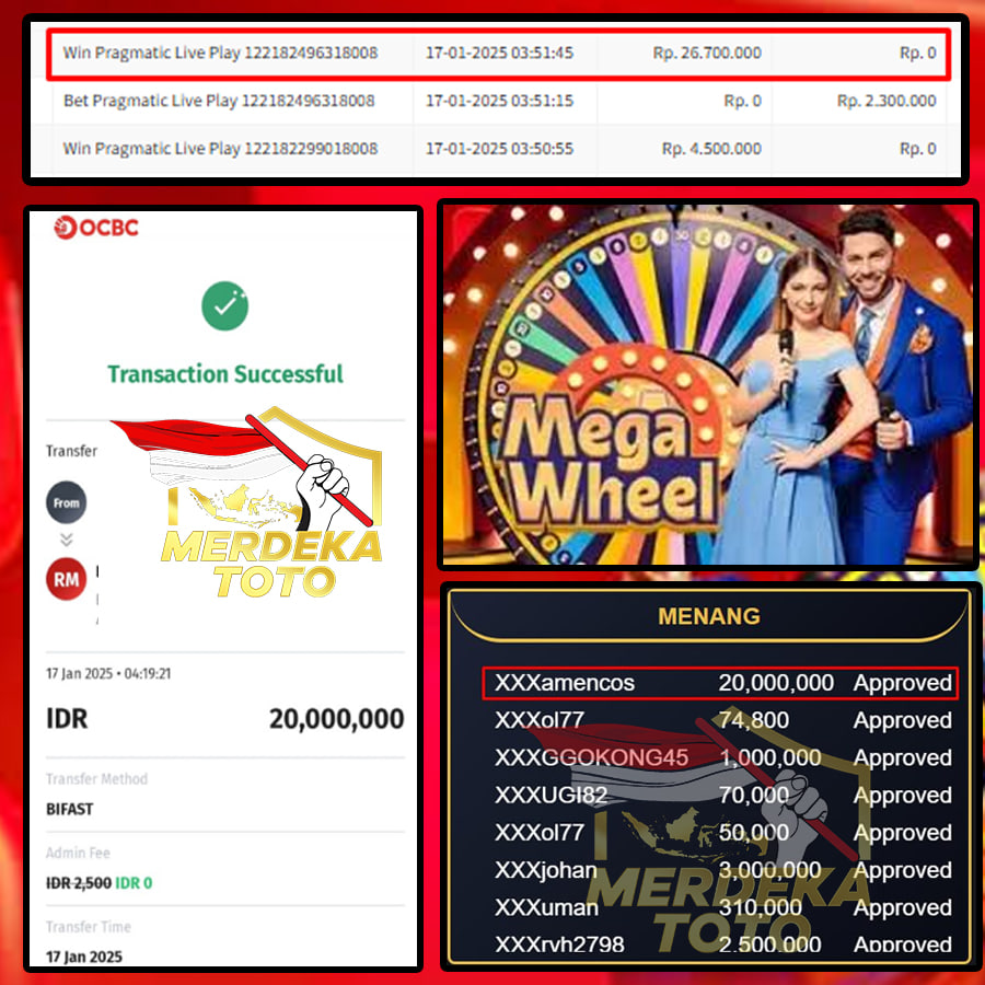 Selamat kepada bosku yang bermain di MERDEKATOTO dengan user id XXXXXXXXOS yang telah mendapatkan kemenangan besar di game MEGA WHEEL > PRAGMATIC LIVE