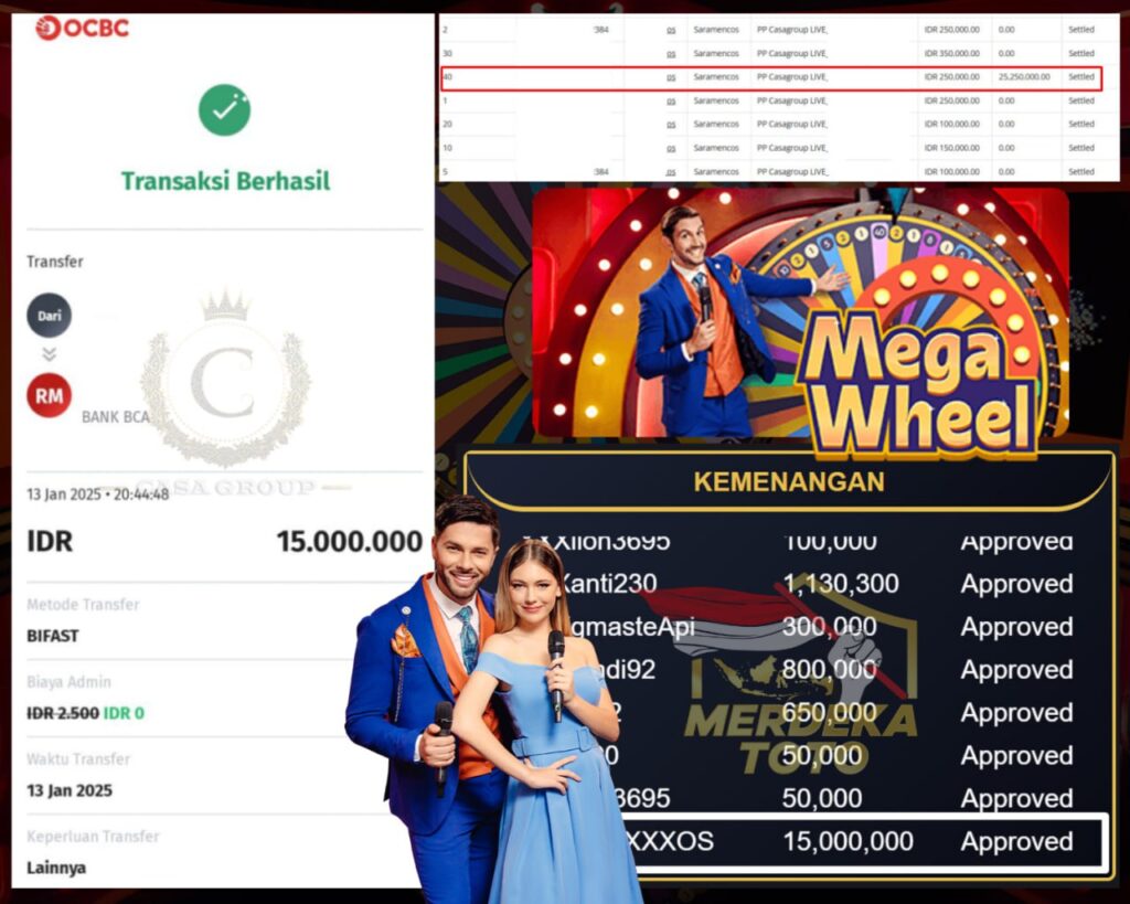 Selamat kepada bosku yang bermain di MERDEKATOTO dengan user id XXXXXXXXOS yang telah mendapatkan kemenangan besar di game MEGA WHEEL > PRAGMATIC LIVE