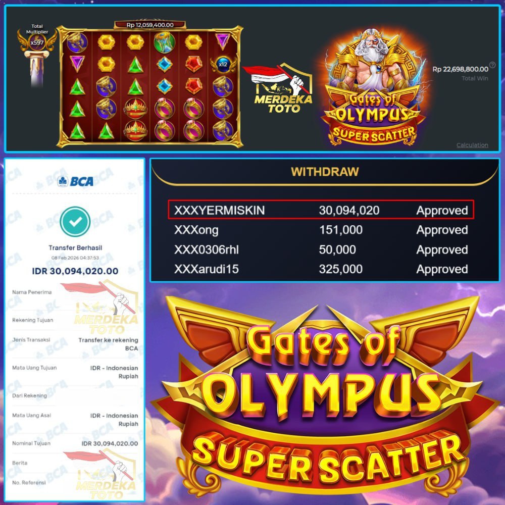 SELAMAT UNTUK MEMBER MERDEKATOTO dengan Username : XXXYERMISKIN berhasil meraih kemenangan besar di permainan GATES OF OLYMPUS SUPER SCATTER – PRAGMATIC PLAY SLOT.