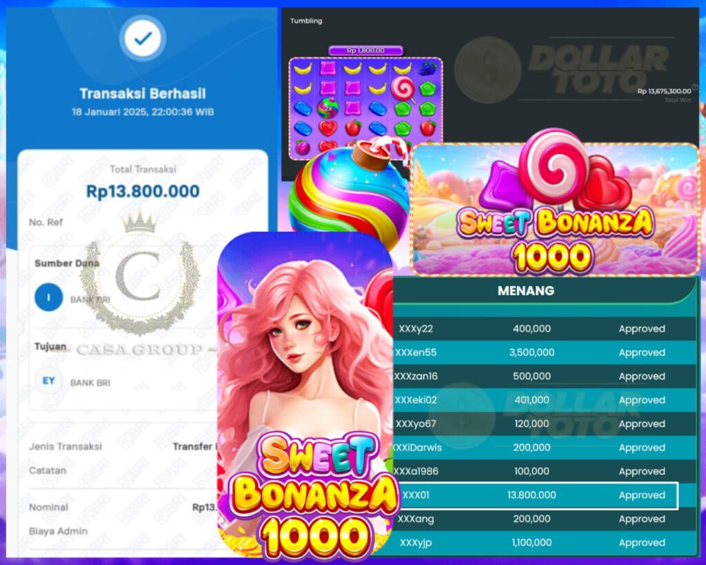 Selamat kepada member DOLLARTOTO user id XXXX01 yang telah mendapatkan kemenangan besar di game PRAGMATIC >> SWEET BONANZA 1000.