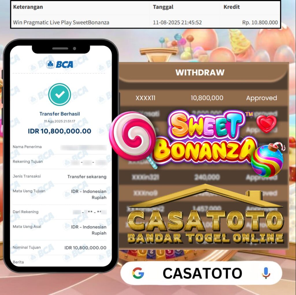 Selamat kepada bosku yang bermain di CASATOTO dengan user ID PXXX18 yang telah mendapatkan kemenangan besar di game SWEET BONANZA CANDY LAND > PRAGMATIC LIVE CASINO