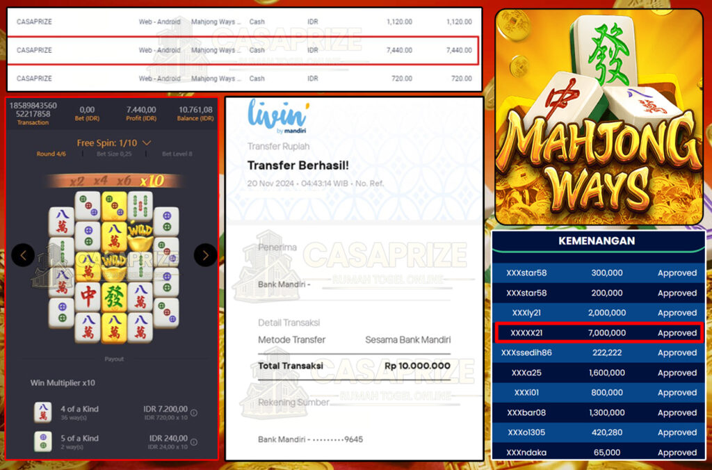 SELAMAT KEPADA MEMBER CASAPRIZE, USER ID : XXXXX21, MENANG DI GAME PG SPFT> MAHJONG WAYS