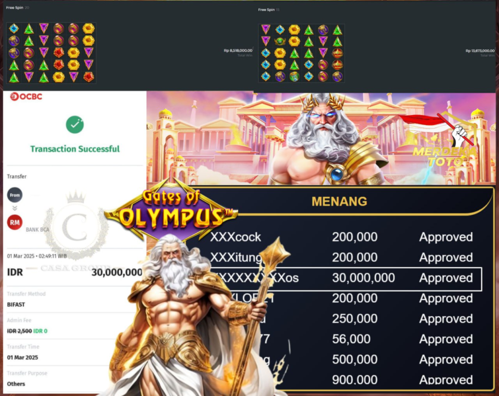Selamat kepada bosku yang bermain di MERDEKATOTO dengan user id XXXXXXXXOS yang telah mendapatkan kemenangan besar di game GATES OF OLYMPUS > PRAGMATIC SLOT.
