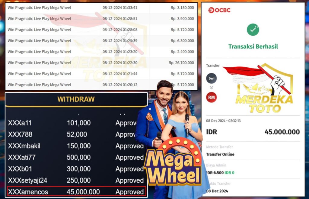 Selamat kepada bosku yang bermain di MERDEKATOTO dengan user id XXXXXXXcos yang telah mendapatkan kemenangan besar di game MEGA WHEEL > PRAGMATIC LIVE
