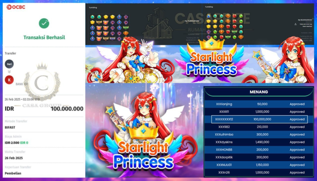 Selamat kepada bosku yang bermain di CASAPRIZE dengan user id XXXXXXX12 yang telah mendapatkan kemenangan besar di game STARLIGHT PRINCESS > PRAGMATIC PLAY.