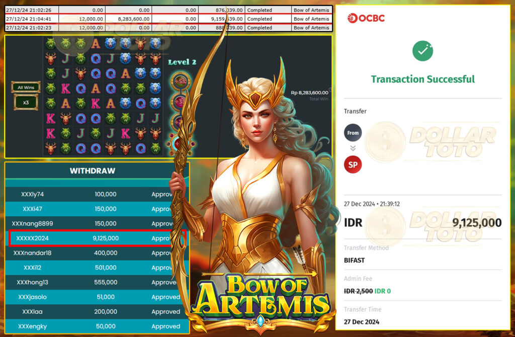 Selamat kepada bosku yang bermain di DOLLARTOTO dengan user id XXXXX2024 yang telah mendapatkan kemenangan besar di game BOW OF ARTEMIS > PRAGMATIC SLOT