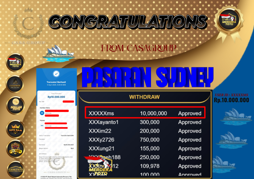 Selamat kepada member User id XXXXXMS yang sudah menang dari hasil bet SYDNEY di situs merdekatoto, Untuk total kemenangan yang di dapatkan sebesar 10 juta sudah di bayar lunas tanpa ada hambatan.
