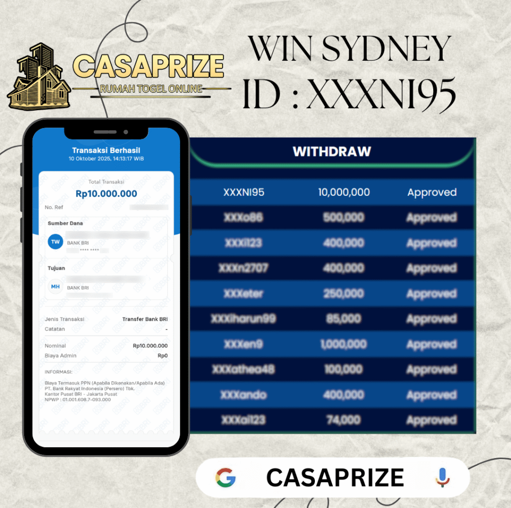 UNTUK MEMBER CASAPRIZE DENGAN USER ID: XXXNI95,