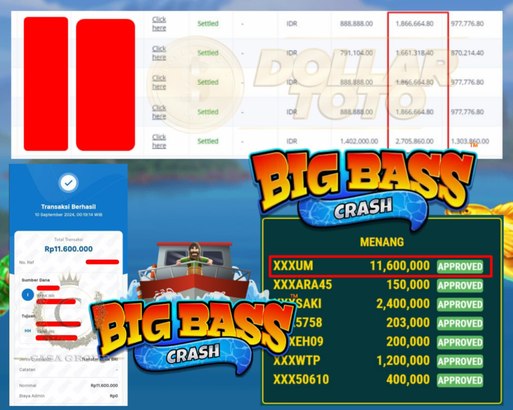 Kami ucapkan selamat kepada User ID XXXUM yang sudah memenangkan permainan BIG BASS CRASH dengan total kemenangan sebesar Rp 11,600,000,- di situs DOLLARTOTO