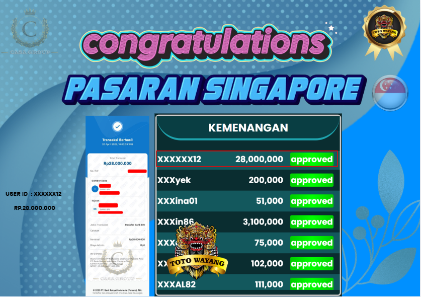 Selamat untuk user id XXXXXXX12 yang sudah menang banyak dari hasil bet pasaran SINGAPORE di situs totowayang, Untuk dana kemenangan sebesar 28 juta sudah berhasil di kirim secepat kilat.