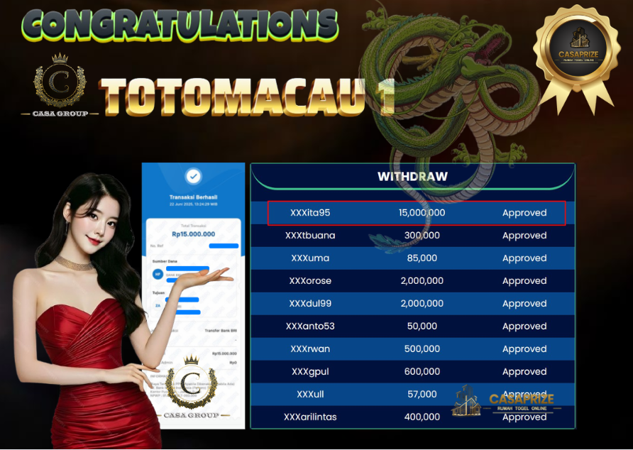 Selamat untuk user id XXXXXX95 yang sudah menang banyak dari hasil bet pasaran TOTOMACAU 1 di situs casaprize,