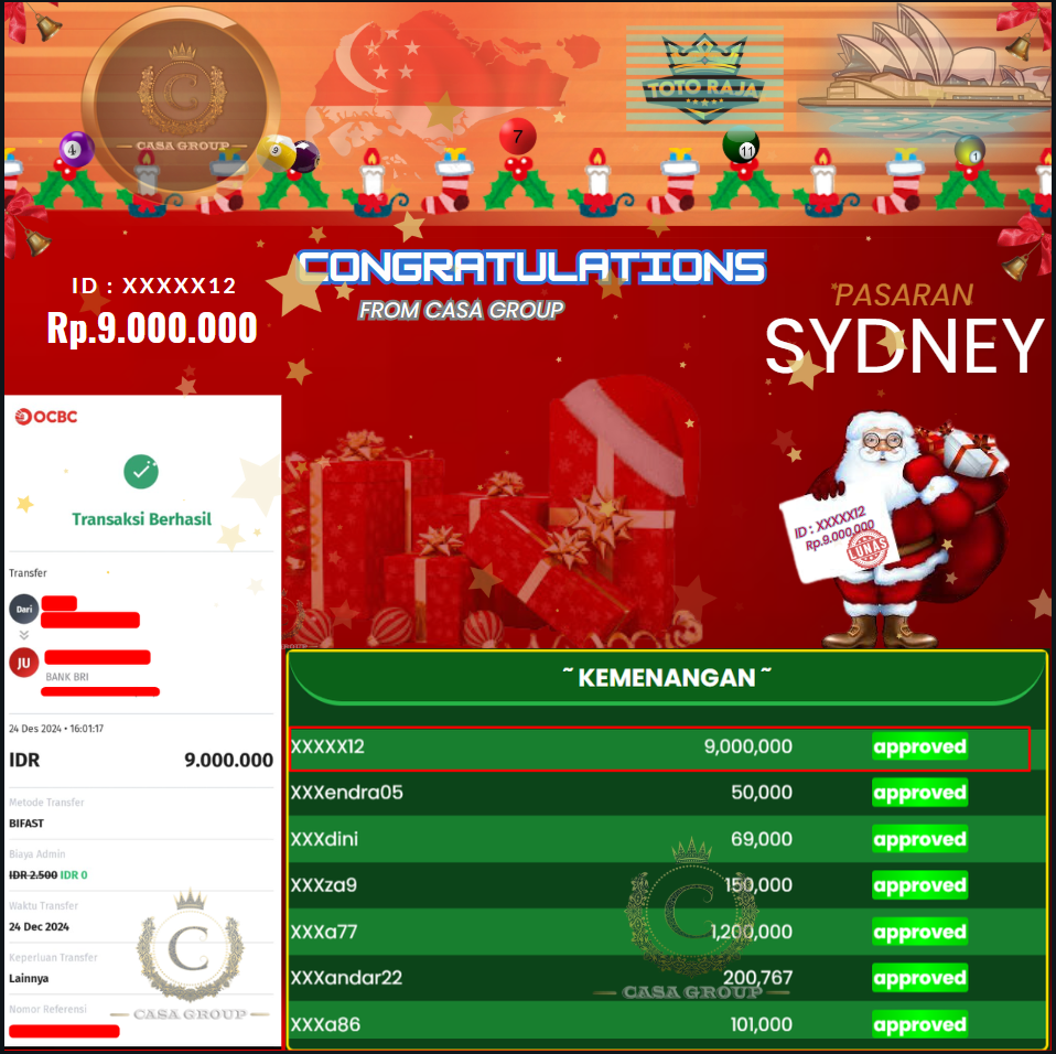 Selamat kepada user id XXXXX12 yang sudah berhasil menang di momen menyambut natal di pasaran SYDNEY di situs totoraja
