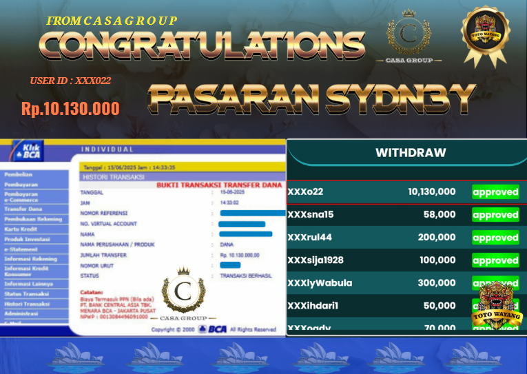 Selamat kepada User id XXXXO22 yang sudah berhasil menang besar dari hasil bet pasaran SYDNEY di situs totowayang dengan Total pencairan sebesar Rp.10.130.000 langsung di bayar LUNAS,