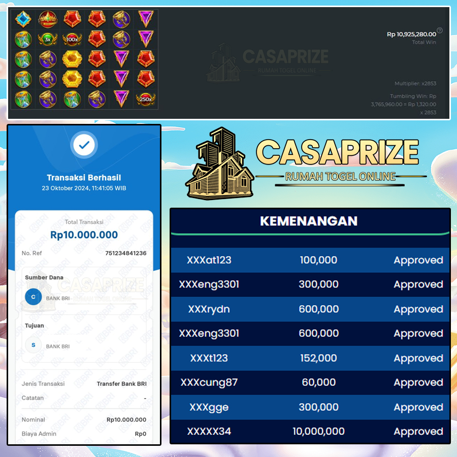 Selamat kepada member kami di situs CASAPRIZE >USER ID XXXXX34 yang telah kembali mendapatkan kemenangan besar secara terus menerus pada permainan GATES OF OLYMPUS 1000. Dan kemenangan yang diraih sebesar Rp.10.000.000