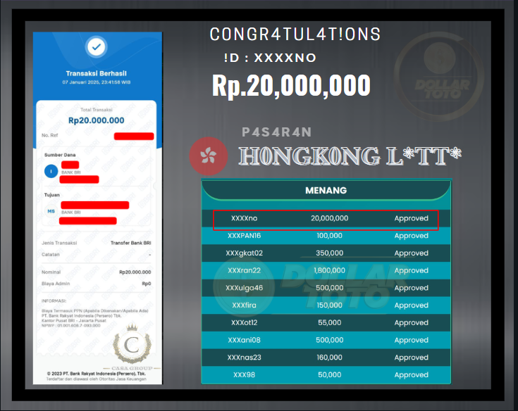 Selamat atas kemenangan besar nya kepada user id xxxxno di pasaran HONGKONG LOTTO .