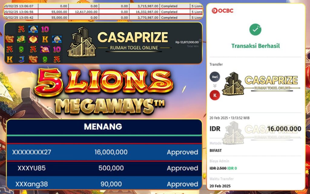 Selamat kepada member CASAPRIZE, user id XXXXXXX27 Yang Telah Mendapatkan Kemenangan Besar di Permainan 5 LIONS MEGAWAYS.