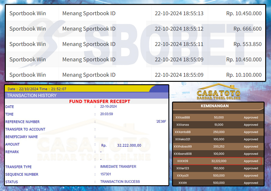 Selamat kepada member kami USER ID XXXXX09 yang telah kembali mendapatkan kemenangan besar secara terus menerus pada permainan SBOBET. Dan kemenangan yang diraih sebesar Rp.32.222.000