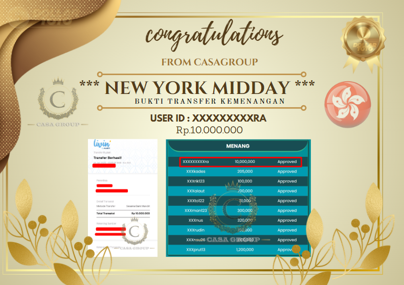 Selamat kepada user id XXXXXXXXXRA yang sudah berhasil menang dari pasaran NEW YORK MIDDAY Untuk total pencairan sebesar 10 juta langsung di bayar LUNAS dan gak pakai lama ,Hanya di BO naungan casagroup yang paling Aman & Terpercaya .Bagi yang mau ikut Yukk segera daftarkan akun baru nya di >> CASAGROUP