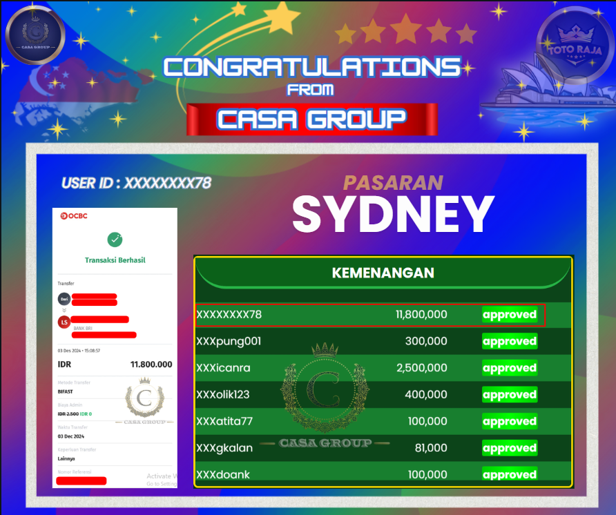 Selamat kepada User id : XXXXXXXXX78 yang sudah menang dari bet pasaran SYDNEY