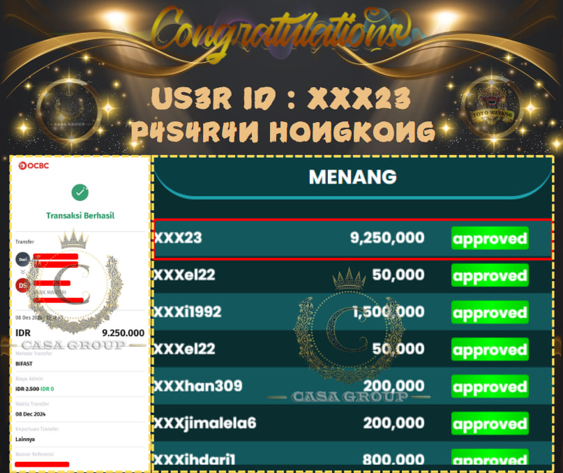 Kami ucapkan selamat untuk User ID XXXX23 yang sudah berhasil menang di pasaran HONGKONG dengan total kemenangan mencapai 9,2 Juta.