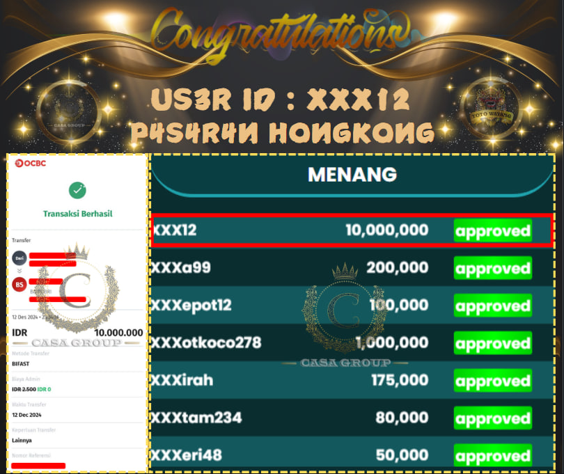 Kami ucapkan selamat untuk User ID XXXX12 yang sudah berhasil menang di pasaran HONGKONG dengan total kemenangan mencapai 10 Juta.