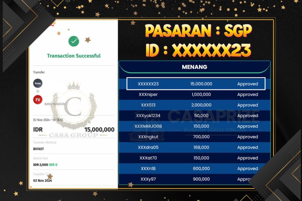 Kami ucapkan selamat untuk User ID : XXXXXX23 yang sudah berhasil menang di pasarang SINGAPORE di situs CASAPRIZE dengan total kemenangan mencapai Rp. 15.000.000 dibayar lunas.