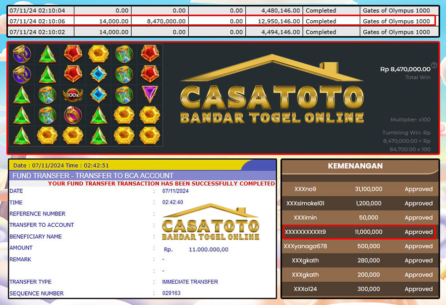 SELAMAT KEPADA MEMBER CASATOTO, USER ID : XXXXXXXXXXt9, MENANG DI GAME PRAGMATIC SLOT> GATES OF OLMPUS 1000