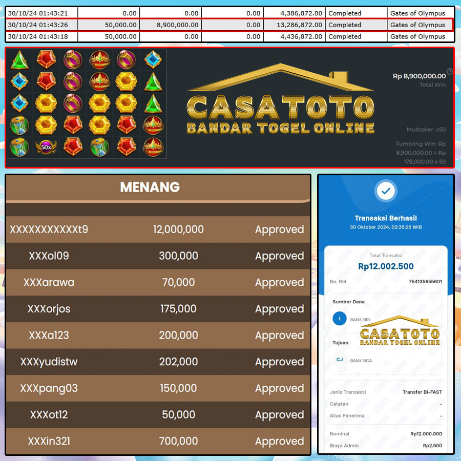 Selamat kepada bosku yang terdaftar di situs CASATOTO atas user id XXXXXXXXXXt9 yang telah mendapatkan kemenangan besar di GATES OF OLYMPUS