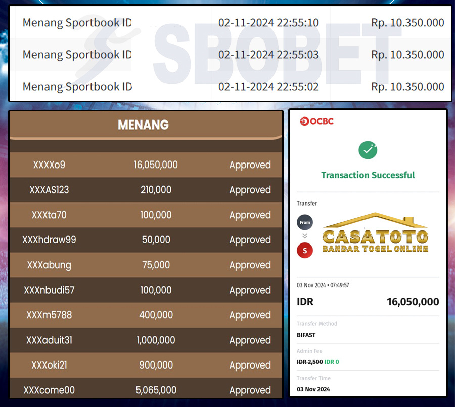 Selamat atas kemenangan boss ku dengan user id XXXXO9 yang telah mendapatkan kemenangan besar di SBOBET dengan kemenangan yang luar biasa.