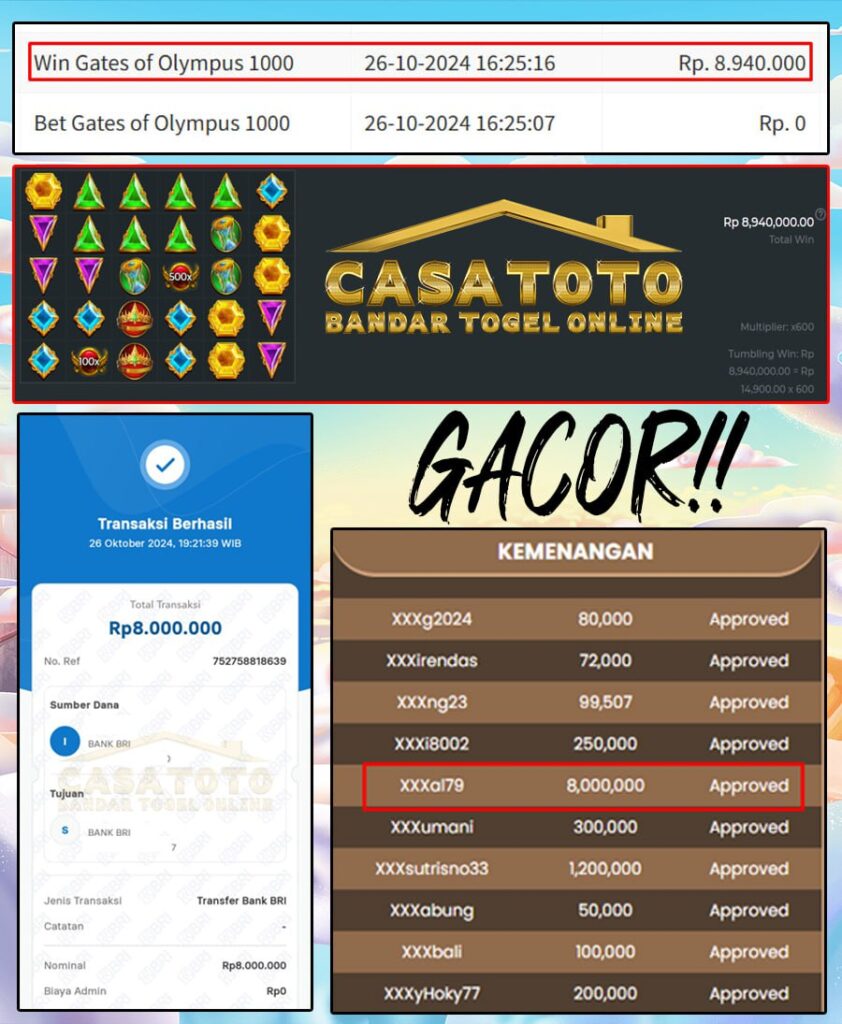 Selamat kepada member kami di CASATOTO user XXXal79 yang sudah mendapatkan kemenangan besar di GATES OF OLYMPUS 1000.