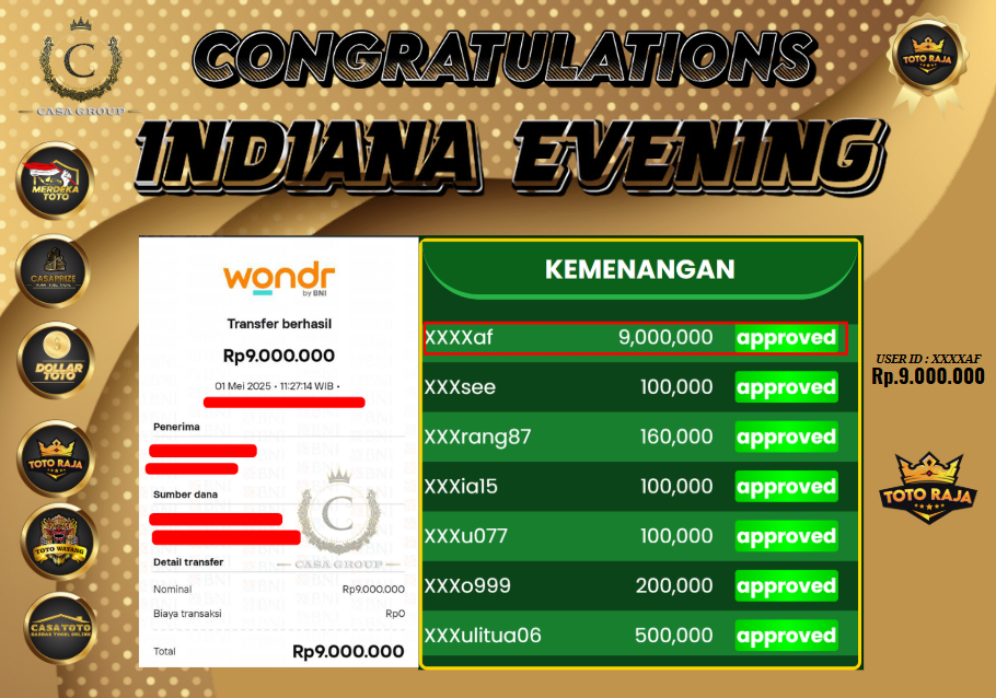untuk total pencairan sebesar 9 juta langsung di bayar lunas tanpa ada hambatan, Hanya di bo casagroup yang proses withdraw nya paling cepat dan terpercaya.