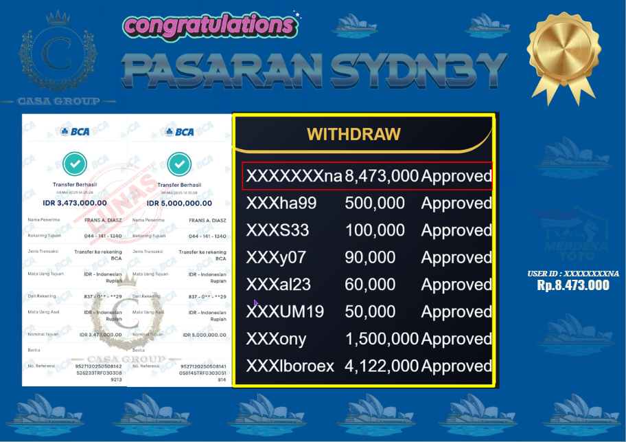 Selamat atas keburuntungan yang berpihak kepada user id xxxxxxxna yang sudah mendapatkan rezeki dari bet SYDNEY di situs merdekatoto total kemenangan sebesar Rp,8.473.000 telah di bayar lunas dan secepat kilat ,