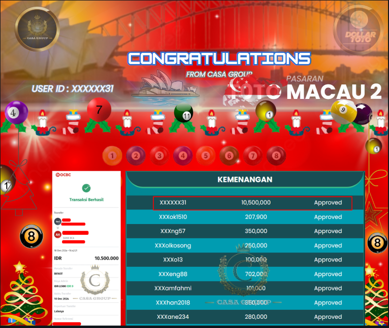 Selamat kepada user id XXXXXXX31 yang sudah berhasil menang dari bet pasaran totomacau di situs dollartoto