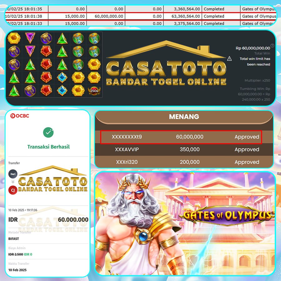 Selamat kepada bosku yang bermain di CASATOTO dengan user id XXXXXXXXXXst9 yang telah mendapatkan kemenangan besar di game GATES OF OLYMPUS⚡️ > PRAGMATIC SLOT