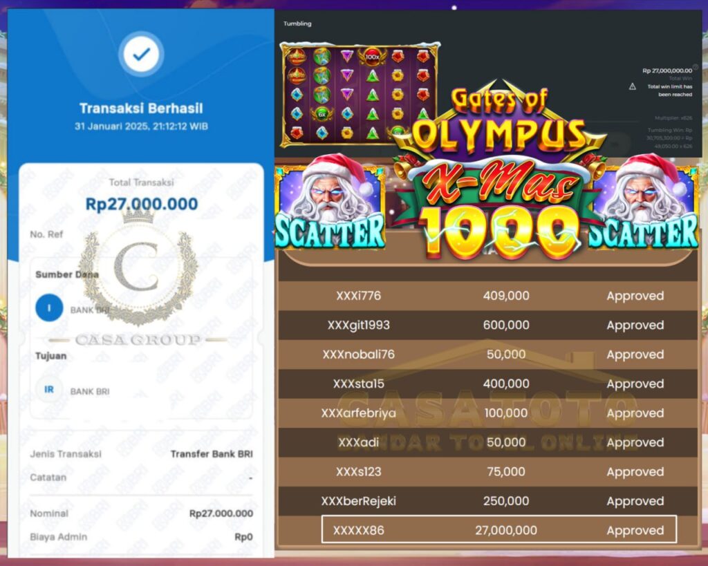 Selamat kepada member CASATOTO user id XXXXX86 yang telah mendapatkan kemenangan besar di game PRAGMATIC PLAY >> GATES OF OLYMPUS XMAS 1000